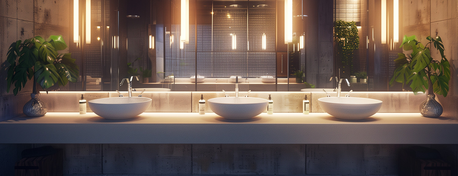 - 4 глубокие раковины в общей комнате. Между сантехникой расстояние 40 см, чтобы расположить влажные полотенца.